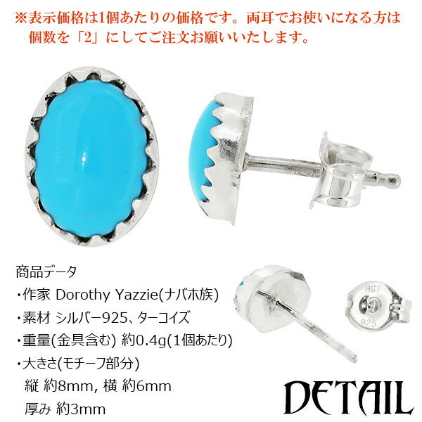 商品データ ・作家 Dorothy Yazzie(ナバホ族) ・素材 シルバー925、ターコイズ ・重量(金具含む) 約0.4g(1個あたり) ・大きさ(モチーフ部分) 縦 約8mm, 横 約6mm 厚み 約3mm (シルバーアクセサリー/ネイティブアクセサリー/ネイティブ風コーデ/ナチュラル系) 【→その他のインディアンジュエリーはこちら】 ※【買い物カゴに入れる】ボタンの下にある【★
