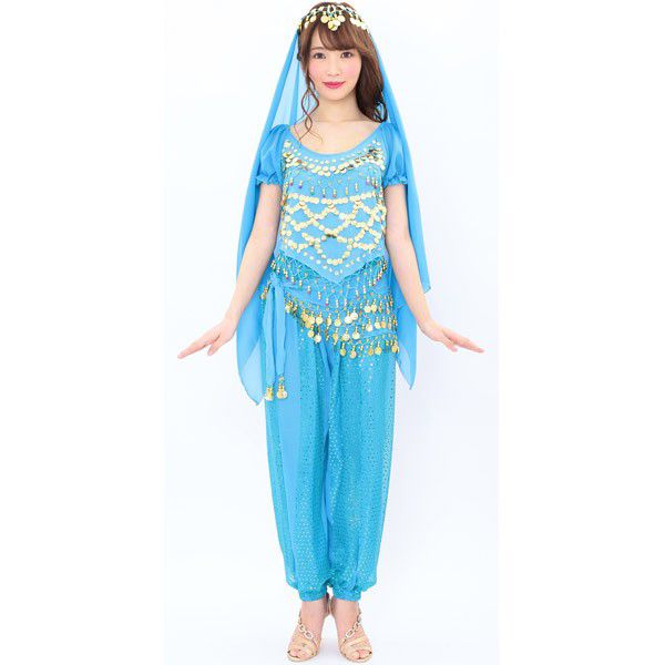 動きやすいパンツタイプの、とってもゴージャスなアラビアンコスチューム! ハロウィンの仮装、コスプレ、ダンスなど、パーティ・イベントに! ◆詳細◆ 内容:ベール・トップス・パンツ・ヒップスカーフ 素材:ポリエステル、洗濯不可 メーカー:Clearstone社、中国製 ◆サイズ◆ 女性用 対応身長:155〜165cm バスト:〜90cm ウエスト:64〜114cm ヒップ:〜126cm トップス丈:40cm 袖丈:20cm パンツ丈:95cm ベール長さ:148cm ヒップスカーフ長さ:145cm モデル身長:162cm ◆着用方法◆ トップスは後ろでリボンを結び着用します。